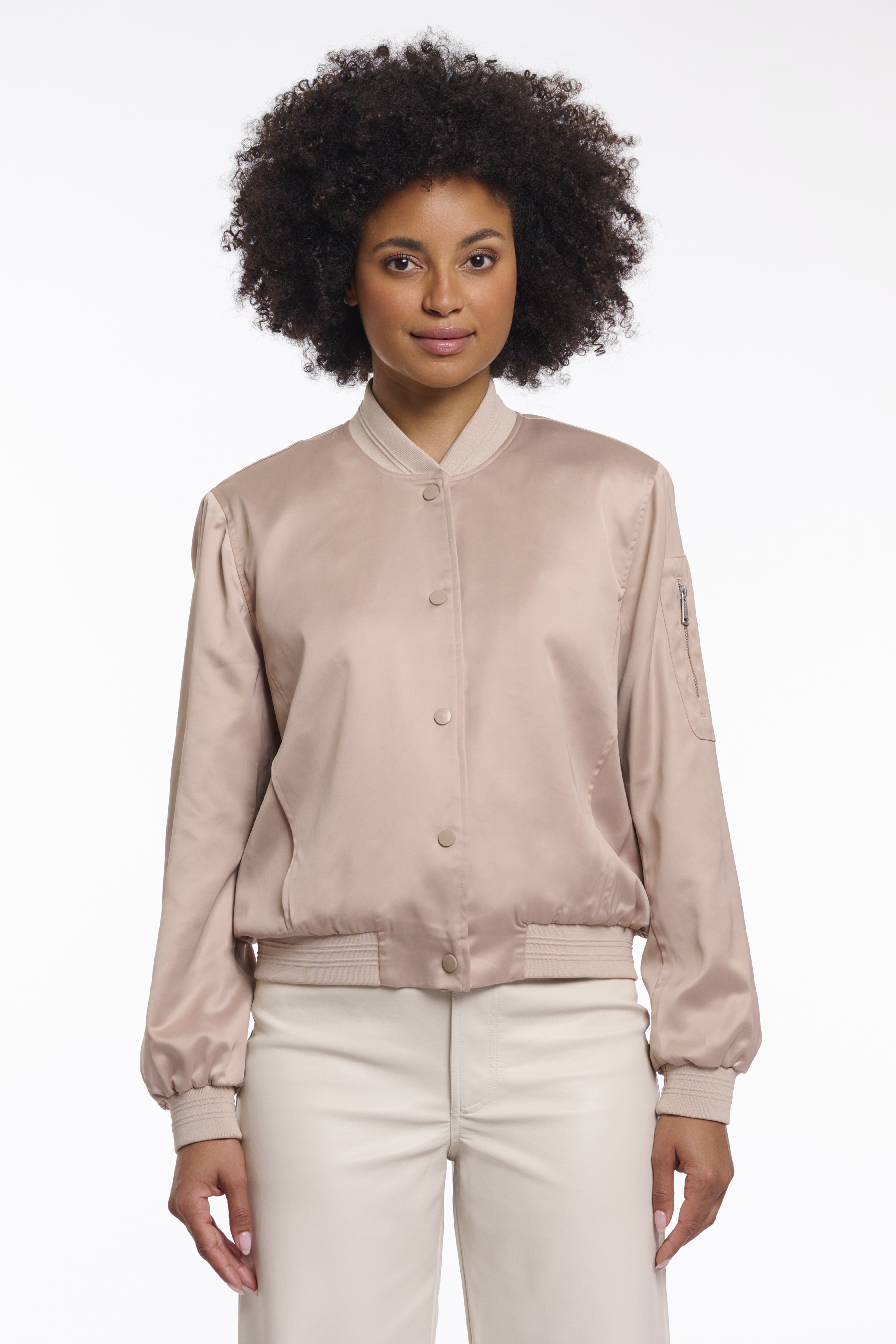 Diese stilvolle Blousonjacke vereint sportiven Chic mit femininer Eleganz. Der zarte Roséton verleiht dem klassischen Bomberstil eine moderne, edle Note und macht die Jacke zum vielseitigen Begleiter für Alltag und Freizeit. Die cleane Silhouette und das angenehm leichte Material sorgen für hohen Tragekomfort und einen zeitlosen Look.