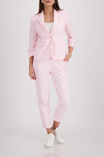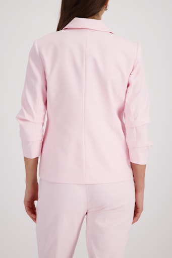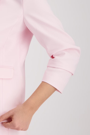 Dieser Blazer setzt ein stilvolles Statement und vereint feminine Eleganz mit moderner Leichtigkeit. In zartem Rosé gehalten, verleiht er jedem Outfit eine frische, edle Ausstrahlung und ist sowohl im Alltag als auch zu besonderen Anlässen ein echter Blickfang. Der taillierte Schnitt schmeichelt der Silhouette und sorgt für eine schöne, feminine Linie. Klassische Elemente wie der Reverskragen, die dezenten Pattentaschen und der Ein-Knopf-Verschluss unterstreichen den zeitlosen Charakter des Blazers. Die 3/4-Ärmel wirken modern und verleihen dem Look eine gewisse Lässigkeit, während die hochwertige, glatte Qualität für ein angenehmes Tragegefühl sorgt.
