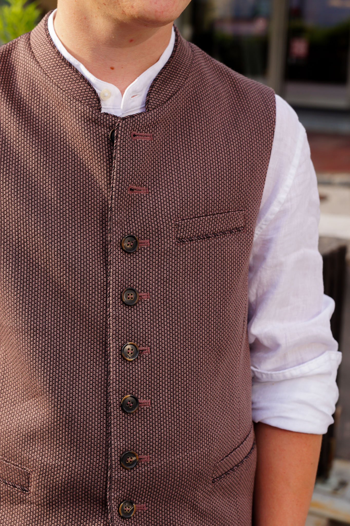 Das Gilet hat einen Stehkragen, zwei Leistentaschen sowie eine Brusttaschen.