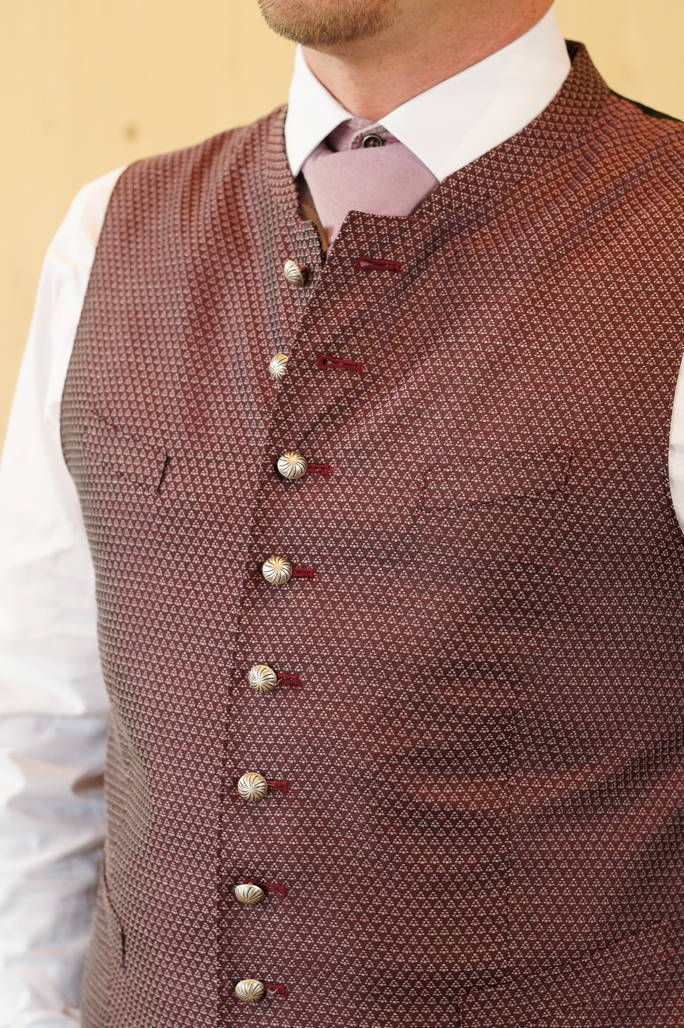 Das Stehkragengilet Ansbach kommt mit einem dezent glänzenden Oberstoff und ist damit sehr festlich.