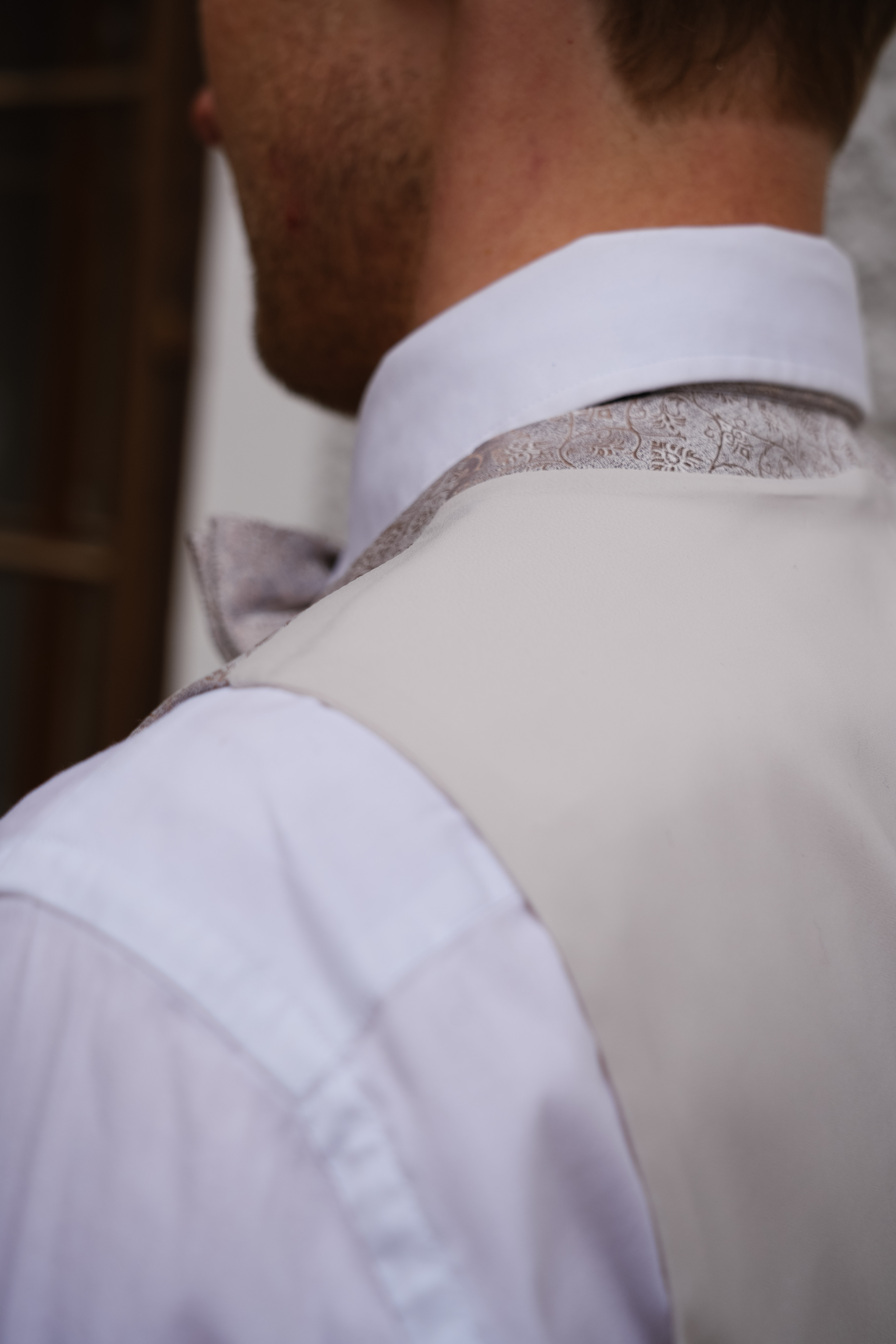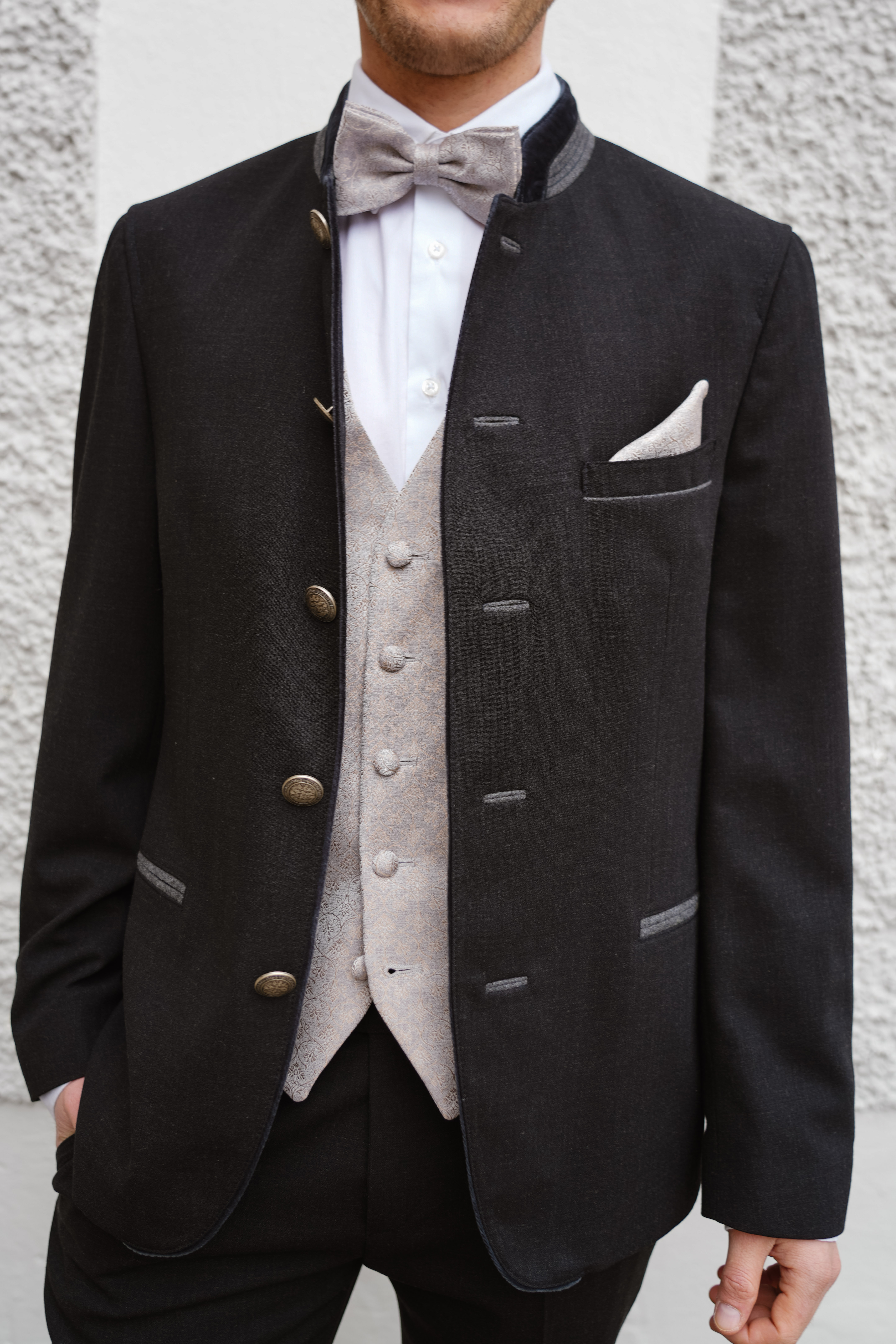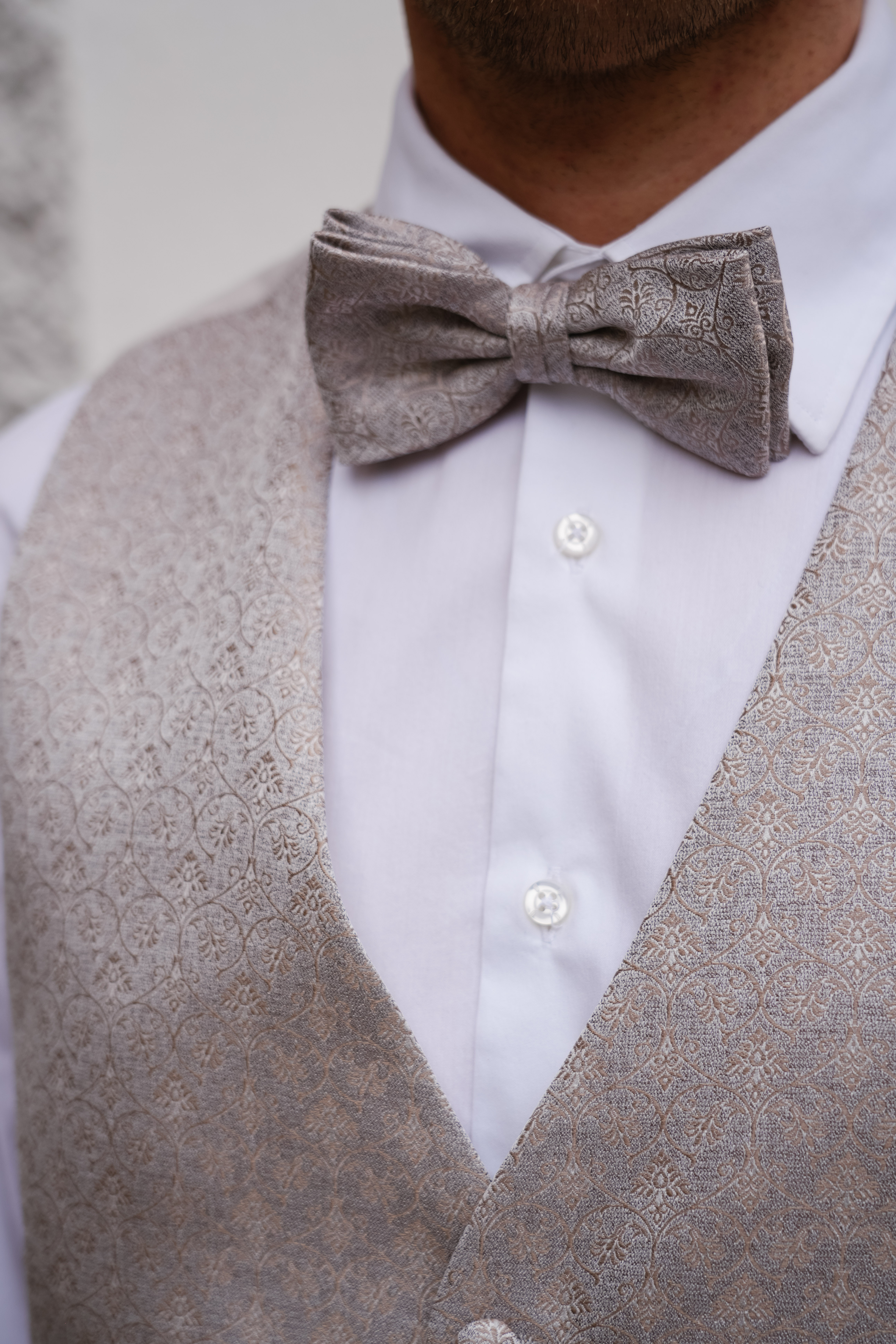 Dieses hochwertige Trachtengilet mit abgestimmter Fliege vereint klassische Eleganz mit feiner Detailverliebtheit. Das edle Jacquardmuster in einem hellen Beige-Ton verleiht dem Set eine besonders stilvolle und festliche Ausstrahlung. Die feine Struktur des Stoffes sorgt für eine exklusive Optik, während die harmonisch abgestimmte Fliege den Look perfekt ergänzt. Die stoffbezogenen Knöpfe unterstreichen die hochwertige Verarbeitung und runden das Gesamtbild elegant ab. Ideal für Hochzeiten, festliche Anlässe oder stilvolle Trachtenauftritte – dieses Set bringt traditionelle Elemente in eine moderne, elegante Form.
