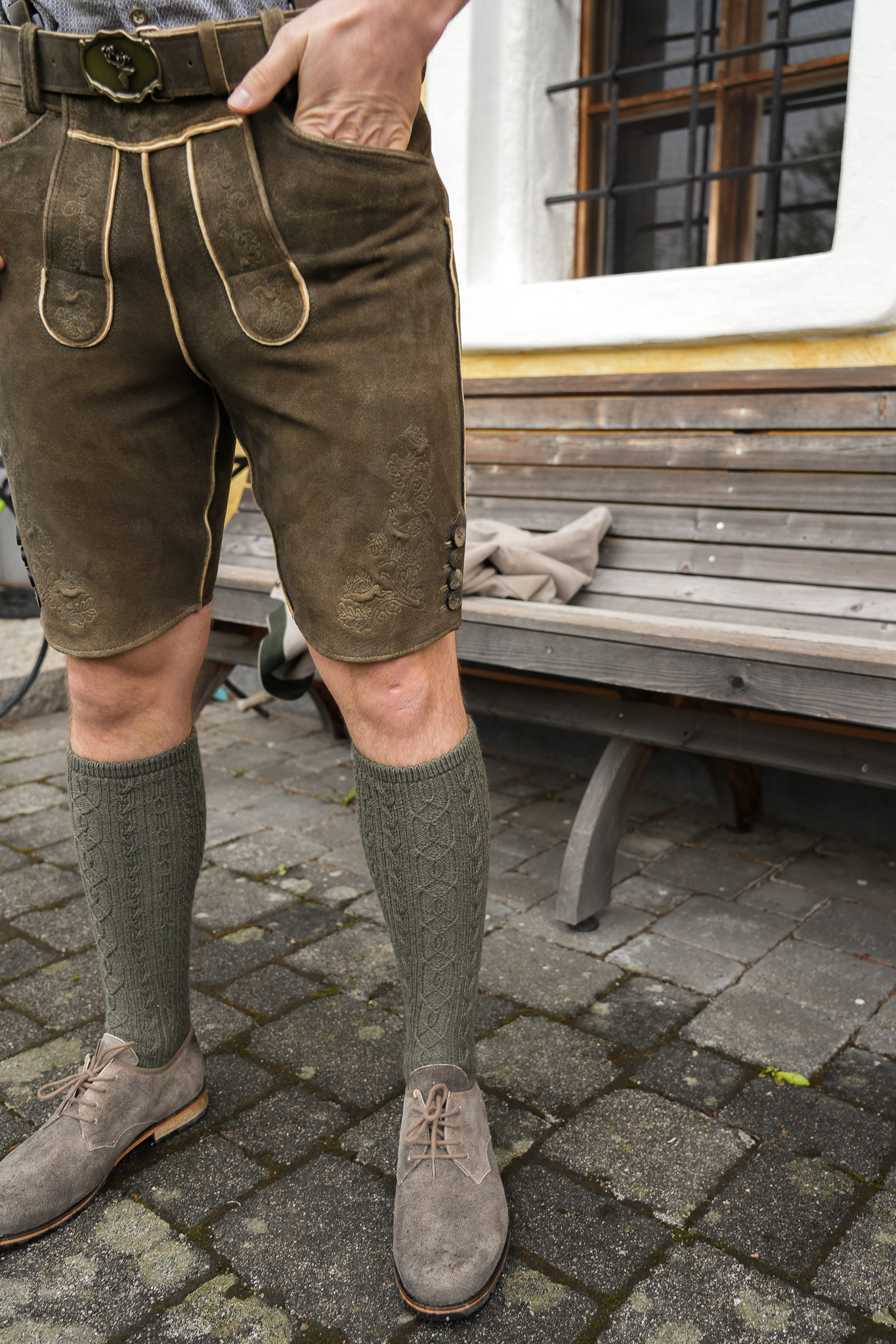 Die Lederhose ist mit einem typischen Hosenlatz mit geknöpftem Eingriff geschnitten.