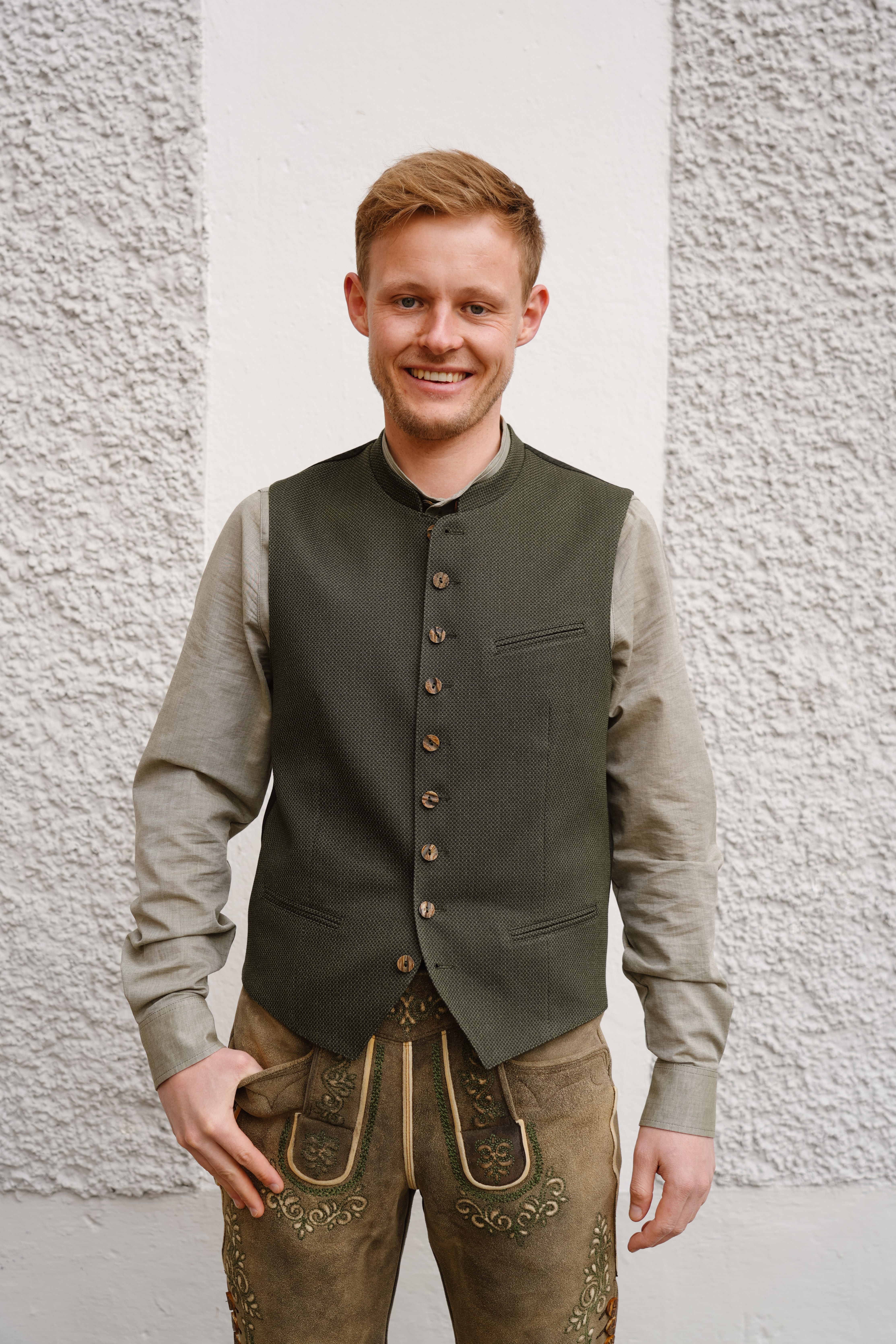 Aufwendig gearbeitete Stickereien in abgestimmten Grüntönen schmücken Vorderseite und Bein und unterstreichen den traditionellen Charakter der Lederhose. Typische Details wie die Messertasche, dekorative Hornknöpfe sowie die seitliche Knopfleiste am Bein ergänzen das stilvolle Gesamtbild.