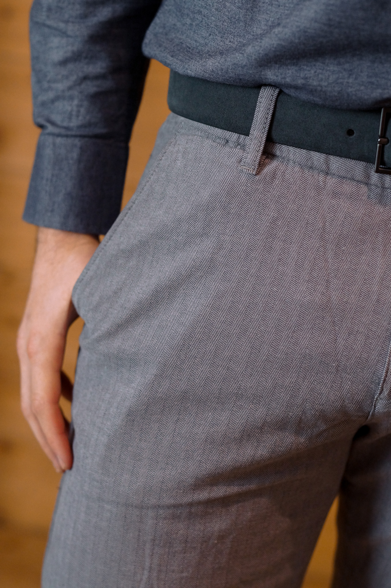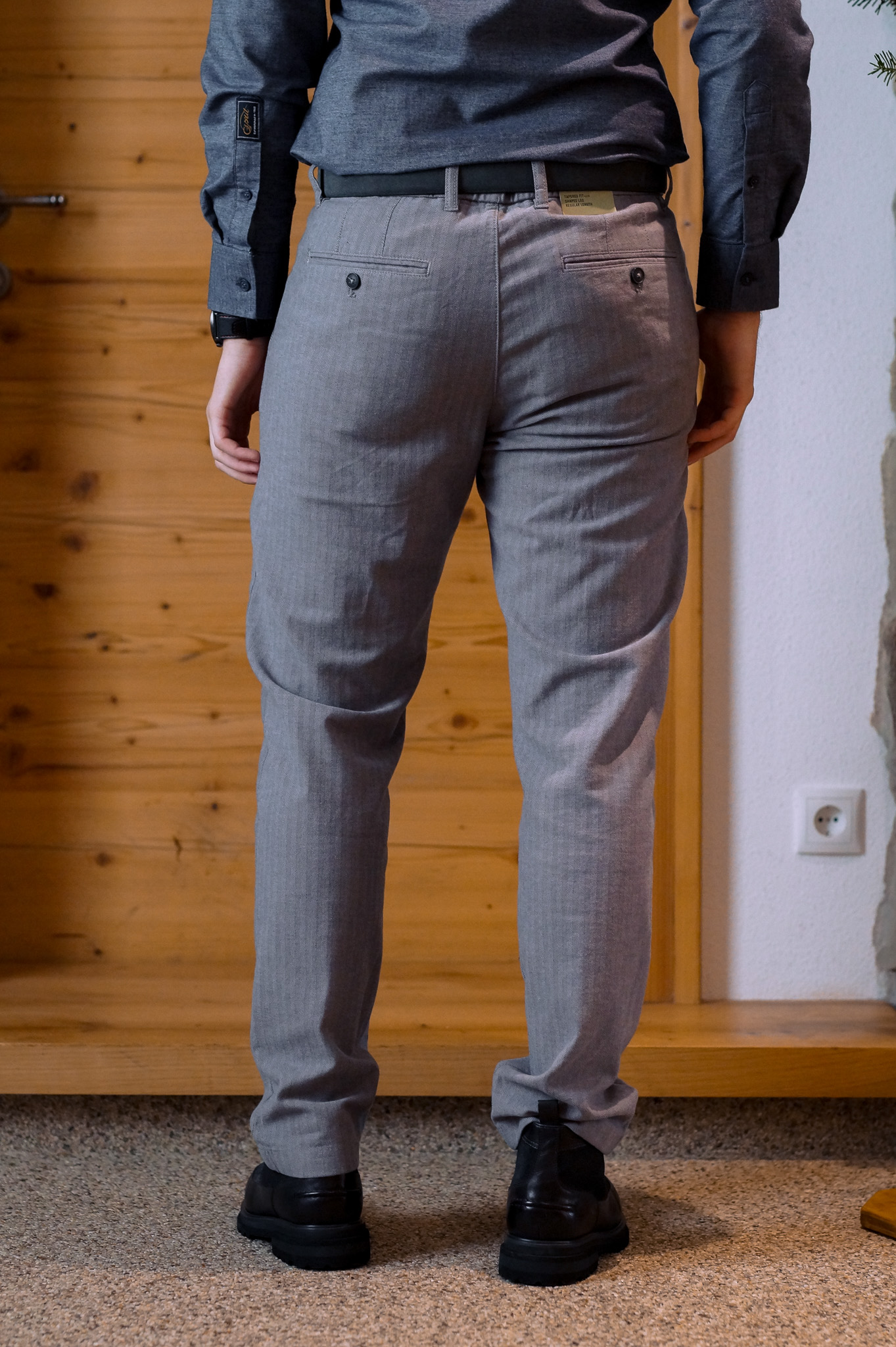 Das Modell ist aus einem Baumwollmix mit Stretchanteil gefertigt und hat eine Woll-Optik mit dezenten Fischgrät-Streifen.