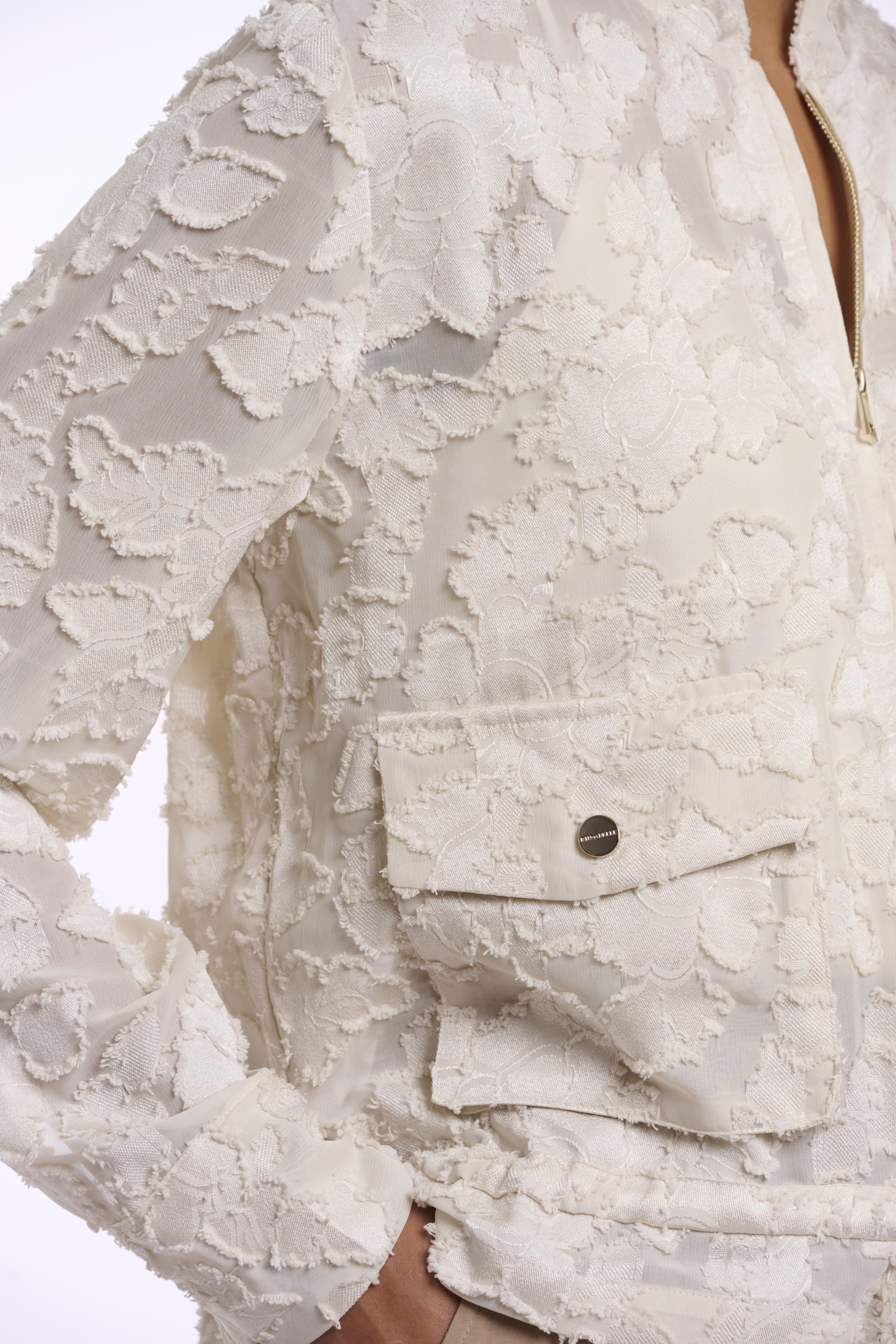Diese stilvolle Damenjacke überzeugt mit ihrer feinen, strukturierten Spitze und einer modernen, femininen Ausstrahlung. Das zarte Material verleiht dem Modell eine edle Leichtigkeit, während der gerade Schnitt für eine zeitlose Silhouette sorgt. Der durchgehende Reißverschluss setzt einen cleanen, modernen Akzent und macht die Jacke besonders vielseitig kombinierbar.