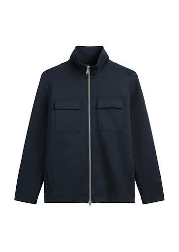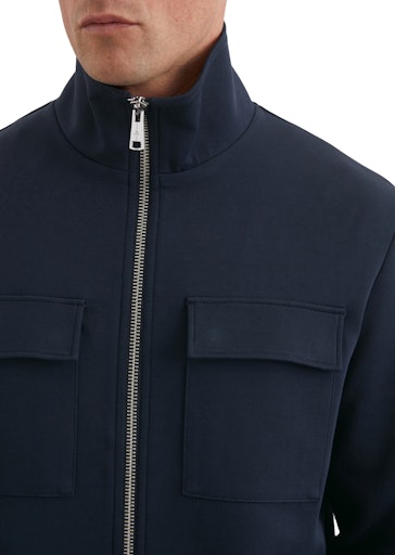 Sportiv. Hochwertig. Bequem. Die lässige Sweatjacke aus zertifizierter Bio-Baumwolle überzeugt mit angenehmem Scuba-Interlock-Sweat. Die glatte, nahezu neoprenartige Oberfläche verleiht dem Stoff Festigkeit und Elastizität. Dank der dichten Interlock-Qualität bleibt die Jacke stabil, formbeständig und zugleich angenehm weich. Der klassische Regular Fit wird durch einen Stehkragen, der auch offen getragen werden kann, und seitliche Eingrifftaschen ergänzt. Klappentaschen auf der Brust mit Druckknöpfen und ein markanter Reißverschluss unterstreichen den modernen Look. Ein gummiertes Logopatch am Oberarm rundet das Design stilvoll ab.