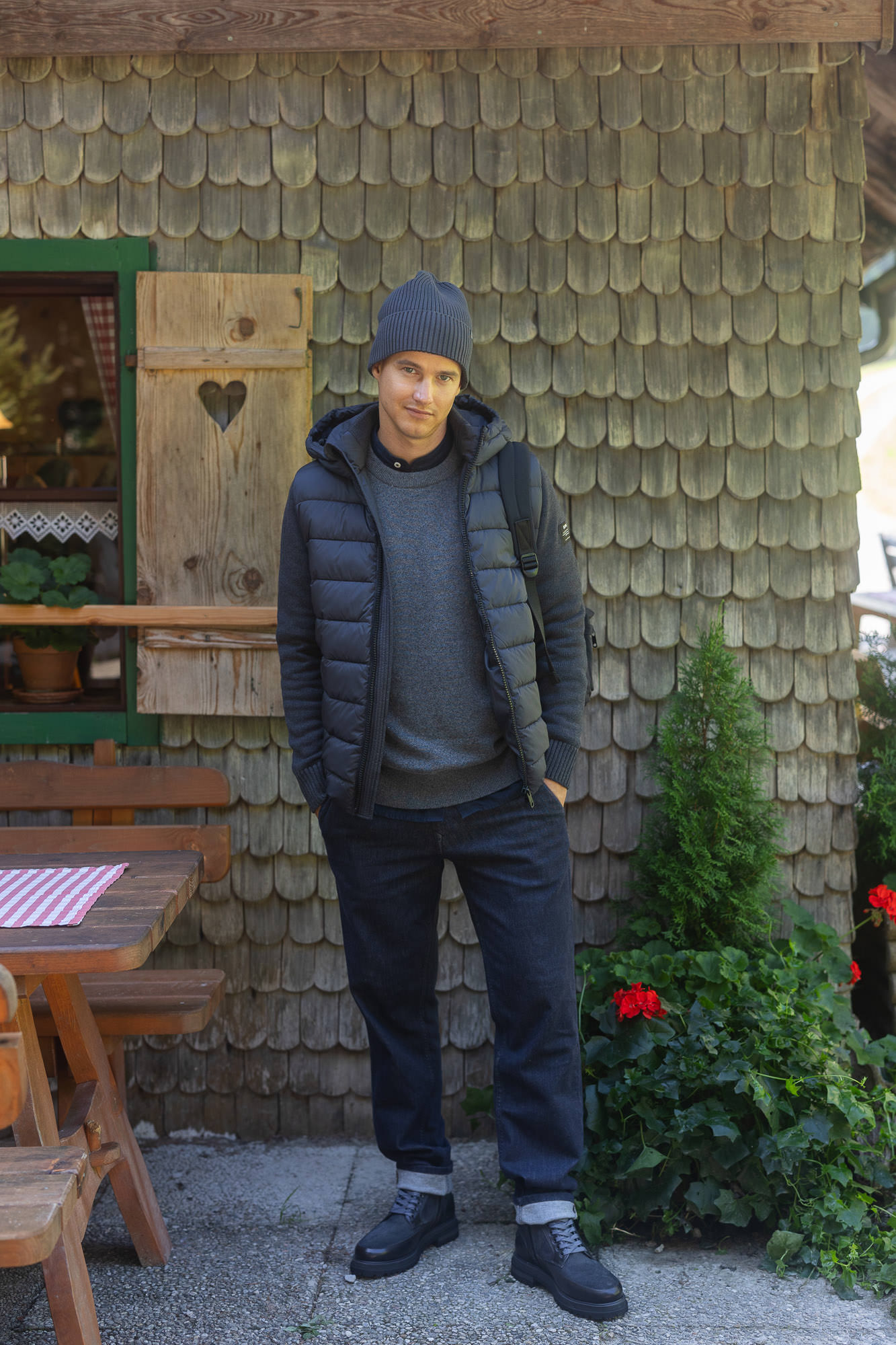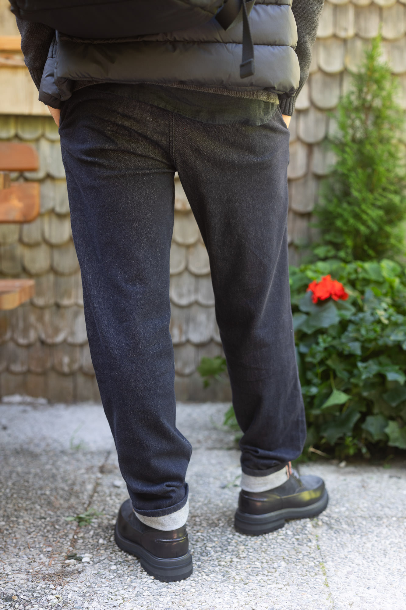 Die leichte Rinsed-Stretch-Denim-Qualität besteht aus zertifizierter Bio-Baumwolle und einem Elasthan-Anteil.