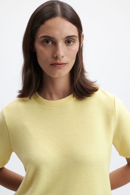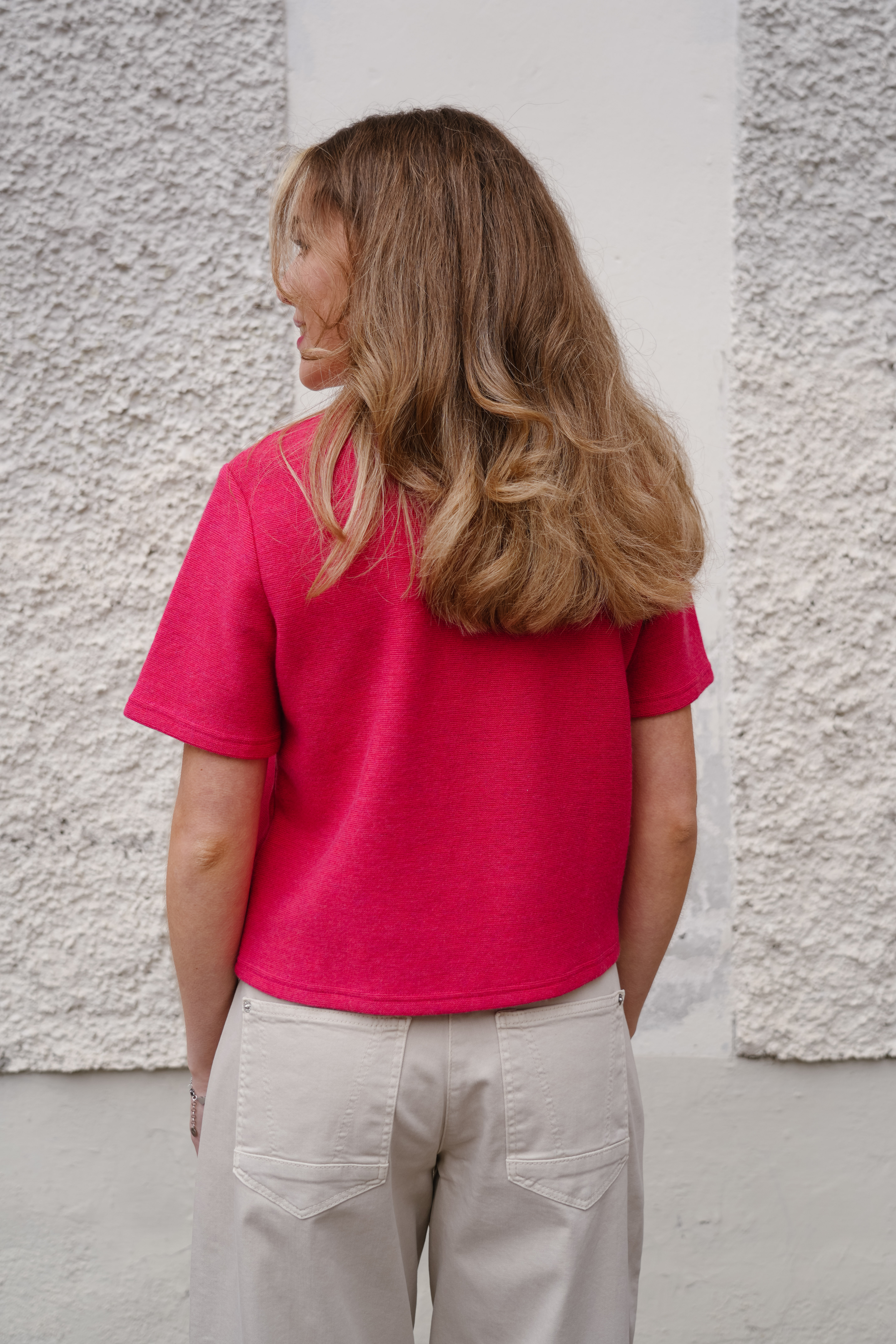 Dieser Pulli vereint schlichte Eleganz mit modernem Komfort und ist ein vielseitiges Essential für jede Garderobe. Die leicht melierte Oberfläche verleiht dem Design eine dezente, hochwertige Struktur, während der klassische Rundhalsausschnitt und die lockere Passform für ein angenehmes Tragegefühl sorgen. Der leicht verkürzte Schnitt unterstreicht den zeitgemäßen Look und lässt sich ideal mit High-Waist-Hosen oder Röcken kombinieren. Die frische, kräftige Farbe setzt einen stilvollen Akzent und macht das Shirt zum perfekten Begleiter für unkomplizierte, modische Alltags-Outfits.