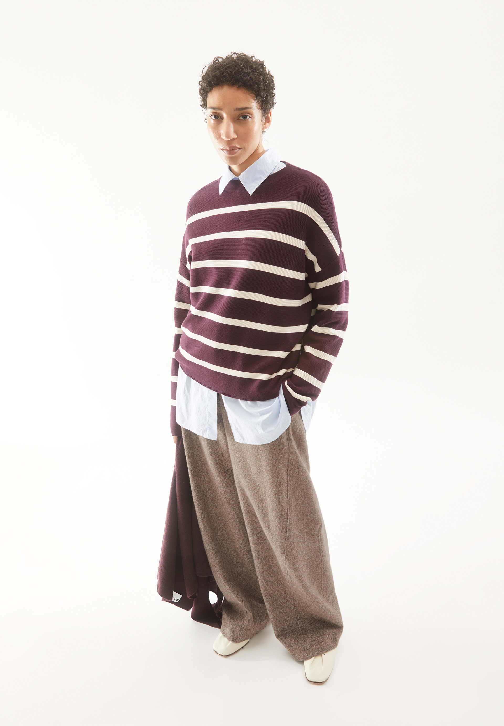 Der Pullover vereint modernen Minimalismus mit einem Hauch maritimem Charme. Das klassische Streifenmuster in Dark Berry und Offwhite sorgt für einen zeitlosen Look, während der entspannte Schnitt für hohen Tragekomfort steht. Durch die überschnittenen Schultern und den weichen, feinen Strick erhält der Pullover eine lässig-elegante Silhouette. Ideal für Alltag und Freizeit.