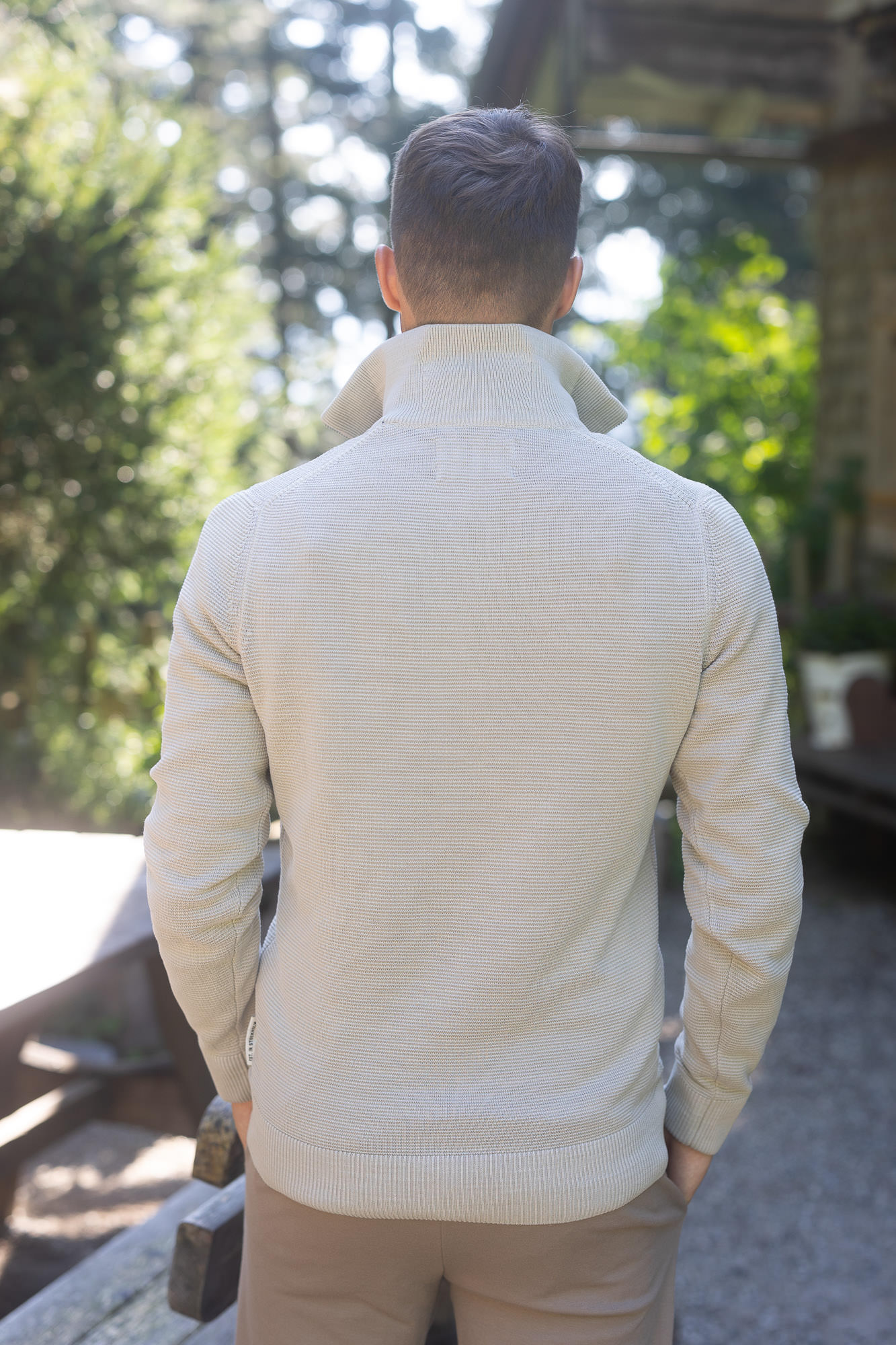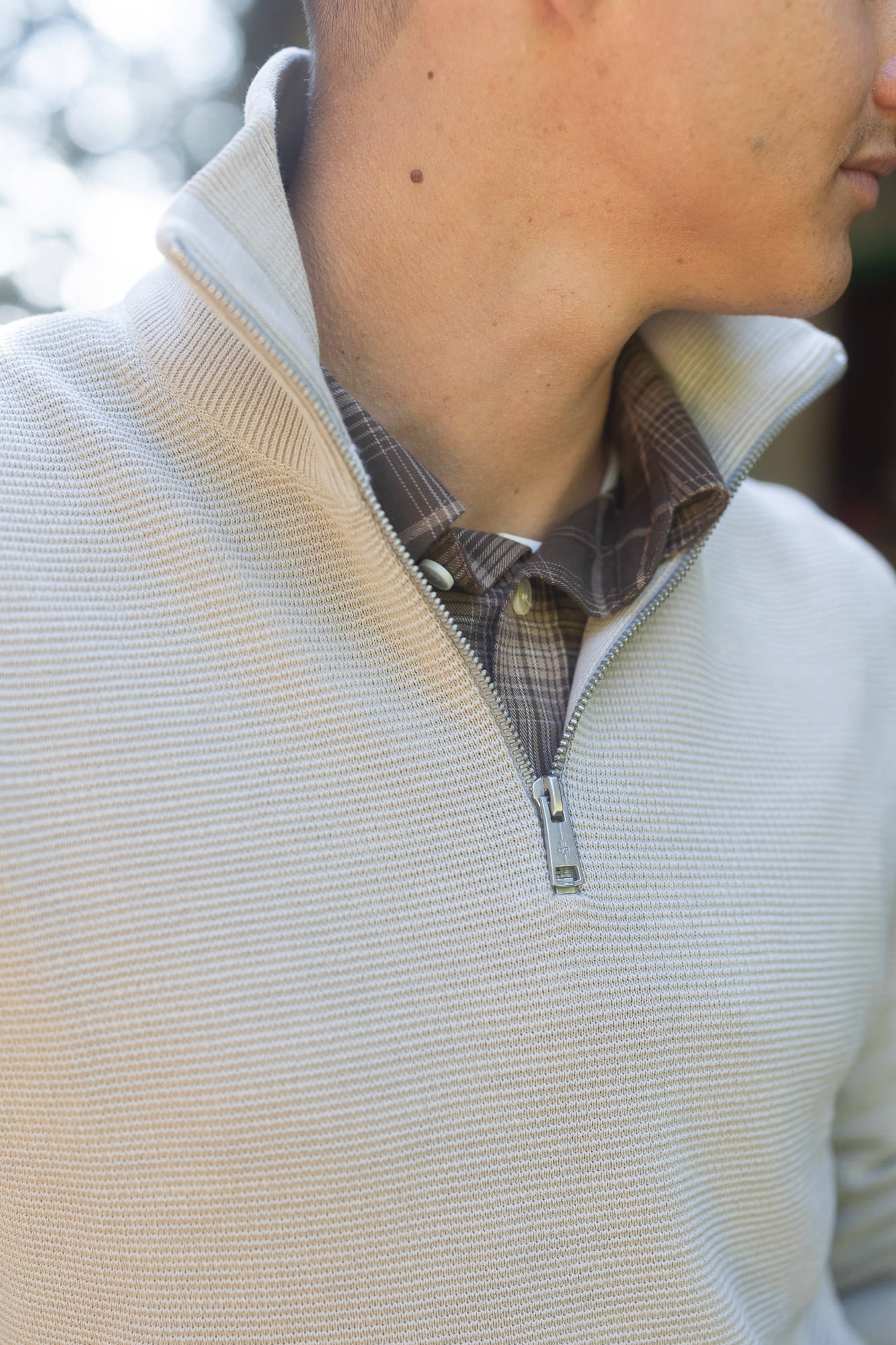 Der kurze Metallreißverschluss am gerippten Troyer-Kragen fügt dem Modell eine raffinierte Note hinzu und ermöglicht eine individuelle Anpassung.