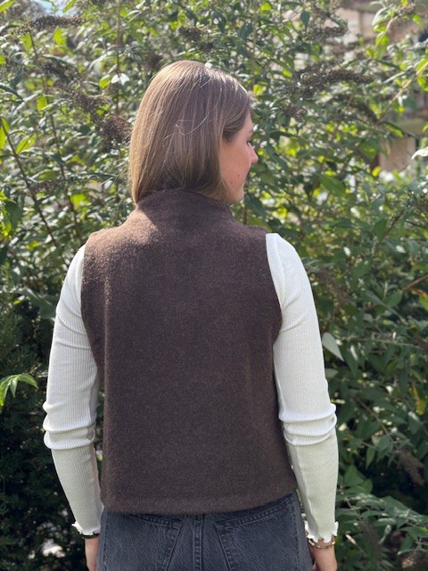 Der Pullunder kommt in einer geraden, leicht verkürzten Passform.