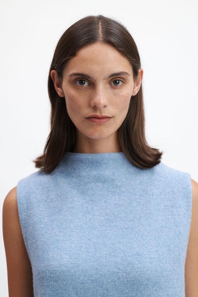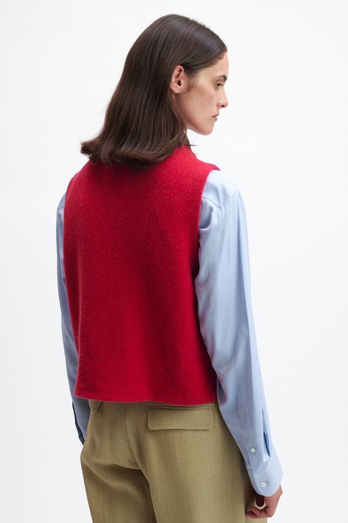 Der Pullunder kommt in einer geraden, leicht verkürzten Passform.