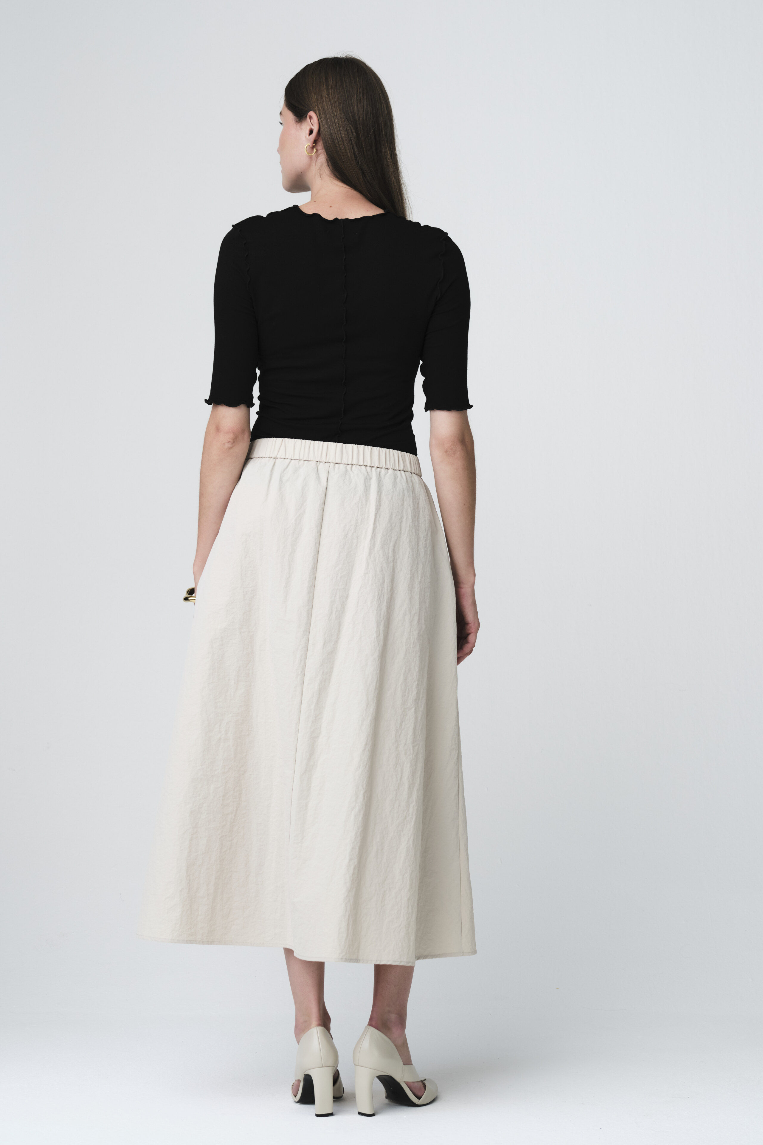 Dieser elegante Midirock begeistert mit seiner zeitlosen Silhouette und einem angenehm leichten Tragegefühl. Der fließende Schnitt sorgt für eine feminine A-Linie, die sanft umspielt und jeder Figur schmeichelt. Der elastische Bund bietet hohen Komfort und eine optimale Passform, ideal für den ganzen Tag.