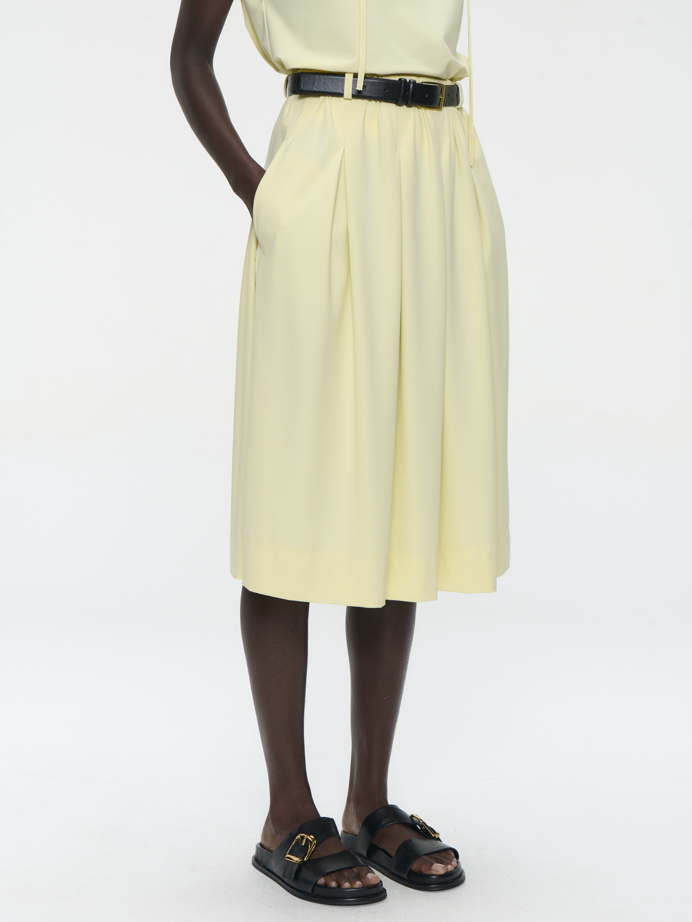 Der Rock begeistert mit seiner fließenden Leichtigkeit und femininen Ausstrahlung. In einem sanften, hellen Gelb gehalten, bringt er Frische und Eleganz in jeden Look und wirkt zugleich modern und zeitlos. Der weich fallende Stoff sorgt für eine wunderschöne Bewegung bei jedem Schritt und umspielt die Figur auf natürliche Weise. Durch die feinen Falten entsteht eine dezente Weite, die dem Rock Volumen verleiht, ohne aufzutragen. Die knieumspielende Länge unterstreicht die feminine Silhouette und macht ihn vielseitig tragbar, sowohl im Alltag als auch zu besonderen Anlässen.