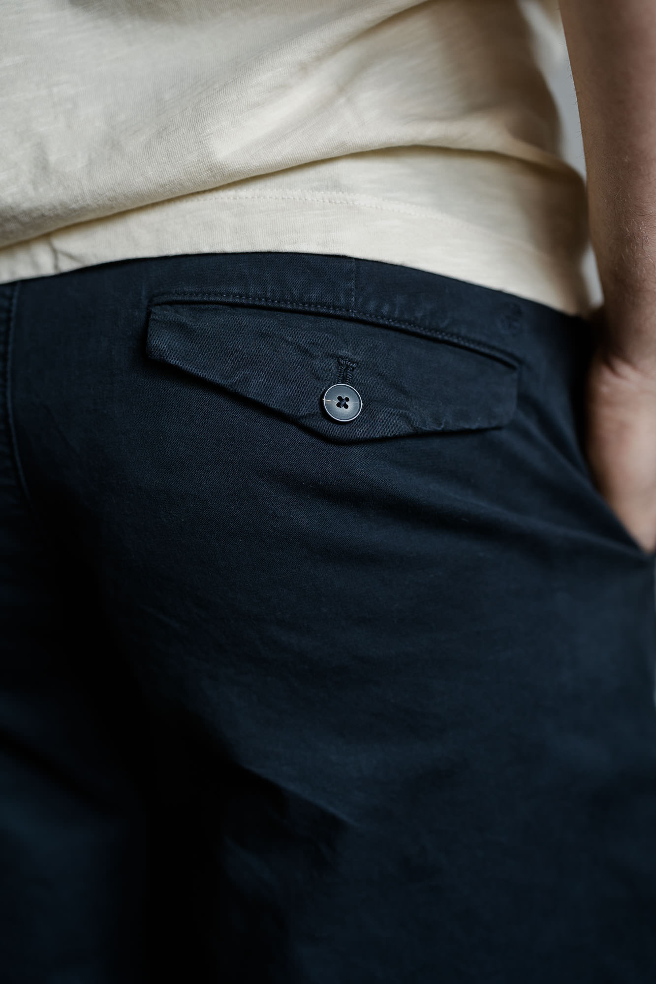 Die Hose kommt mit einer klassischen Bundverarbeitung, seitlichen Eingriffstaschen und geknöpften Klappentaschen auf der Hinterseite.