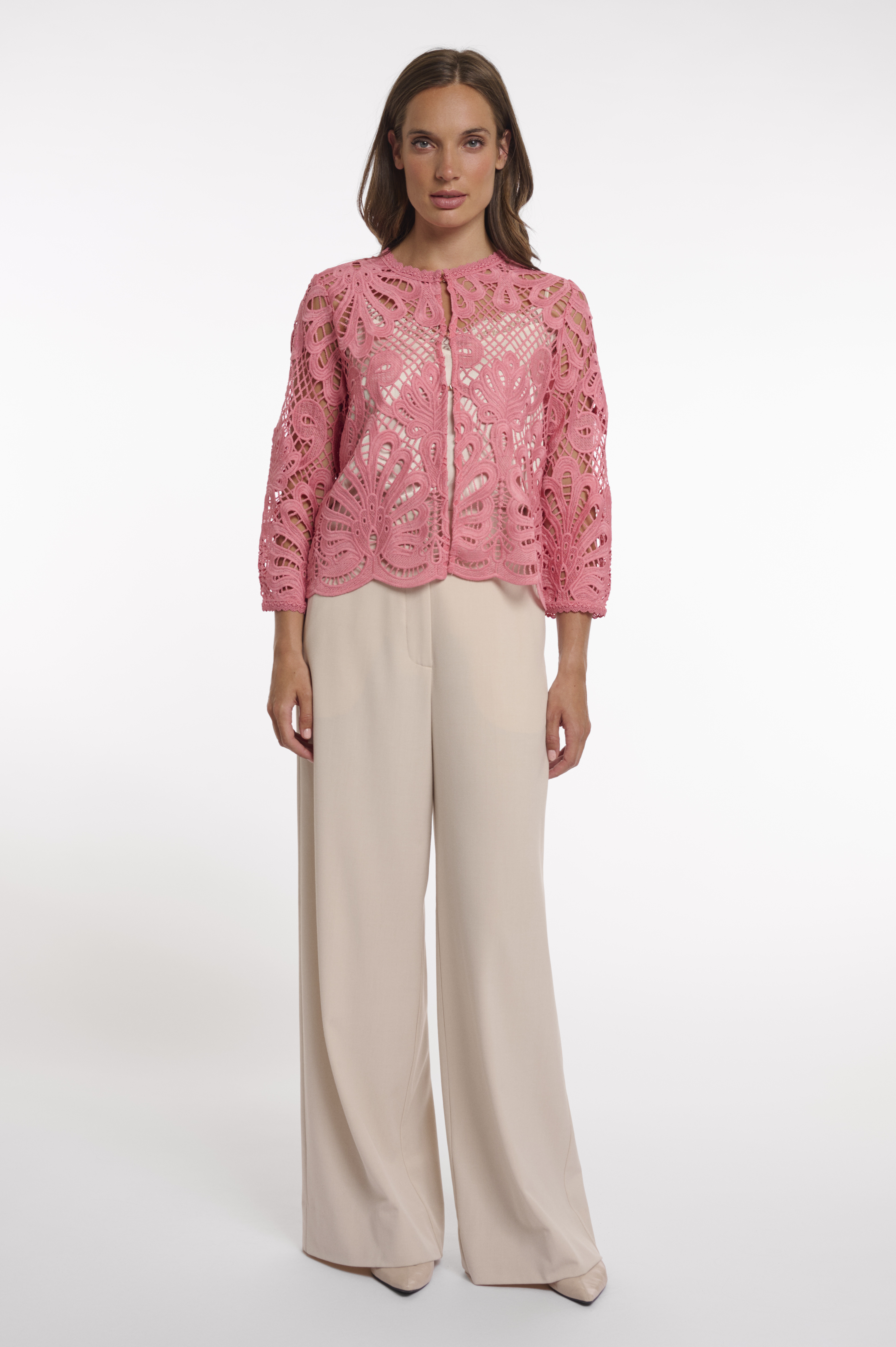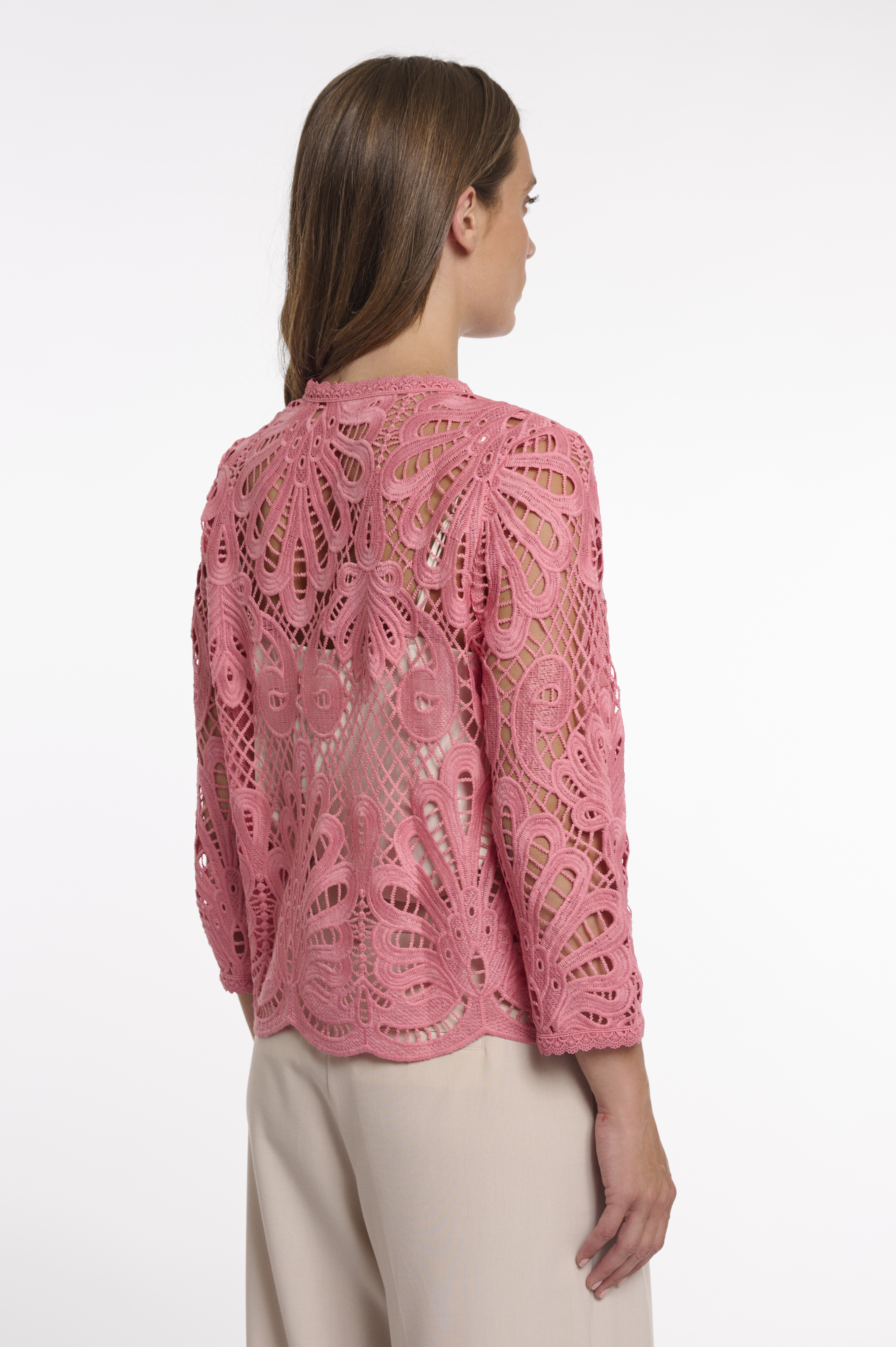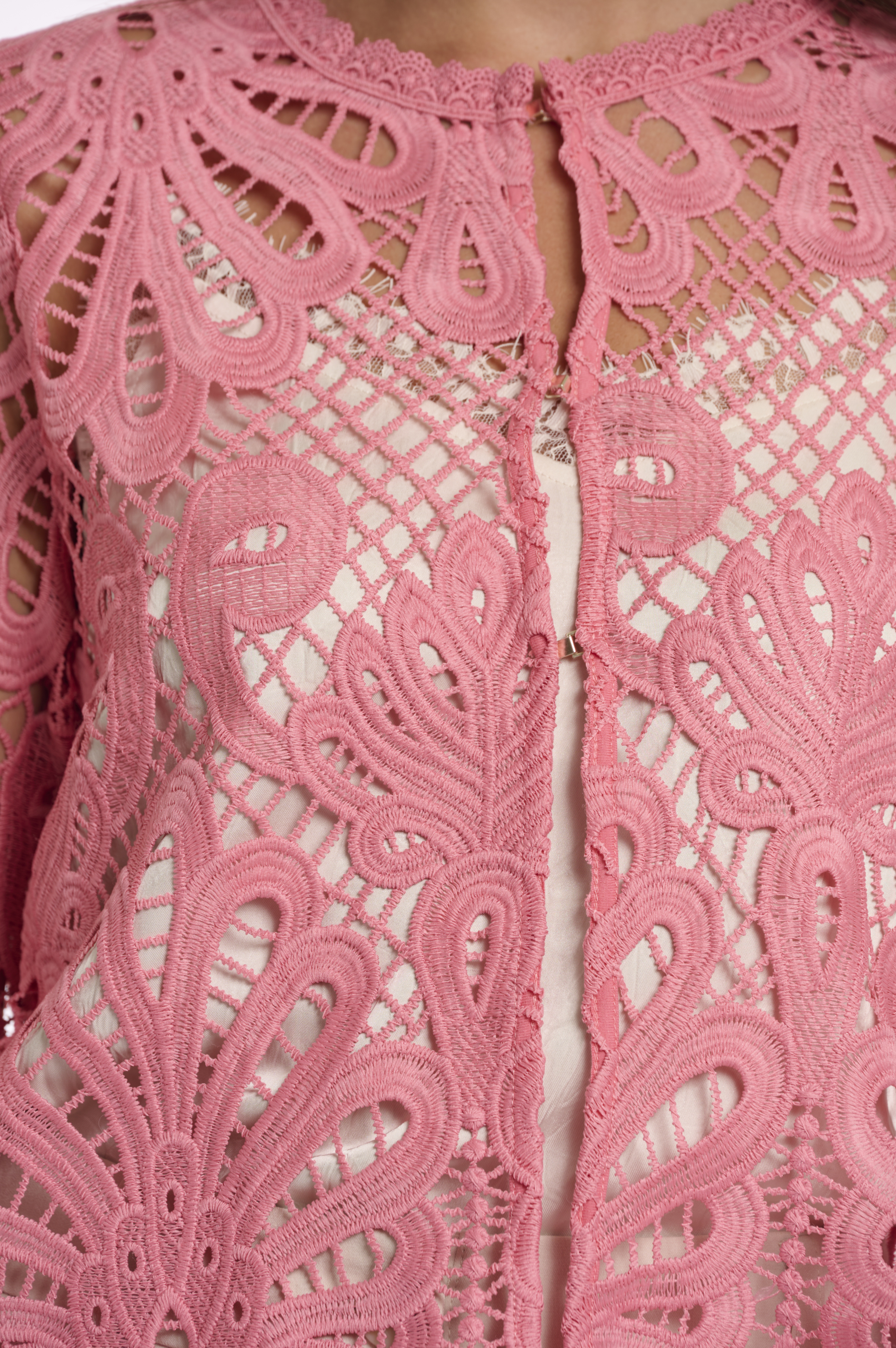 Diese edle Spitzenjacke überzeugt mit ihrem kunstvollen Design und femininer Leichtigkeit. Das aufwendig gearbeitete Lochmuster verleiht dem Modell eine besondere Tiefe und macht es zu einem stilvollen Highlight für festliche Anlässe. Die verkürzte, leicht kastige Form sorgt für eine moderne Silhouette, während die 3/4-Ärmel und der feine Rundhalsausschnitt dem Look eine elegante Note verleihen. Die filigranen Hakenverschlüsse vorne unterstreichen das hochwertige Design und ermöglichen ein dezentes Schließen. Perfekt kombinierbar über Kleidern oder eleganten Outfits, ein vielseitiges Key-Piece für besondere Momente.