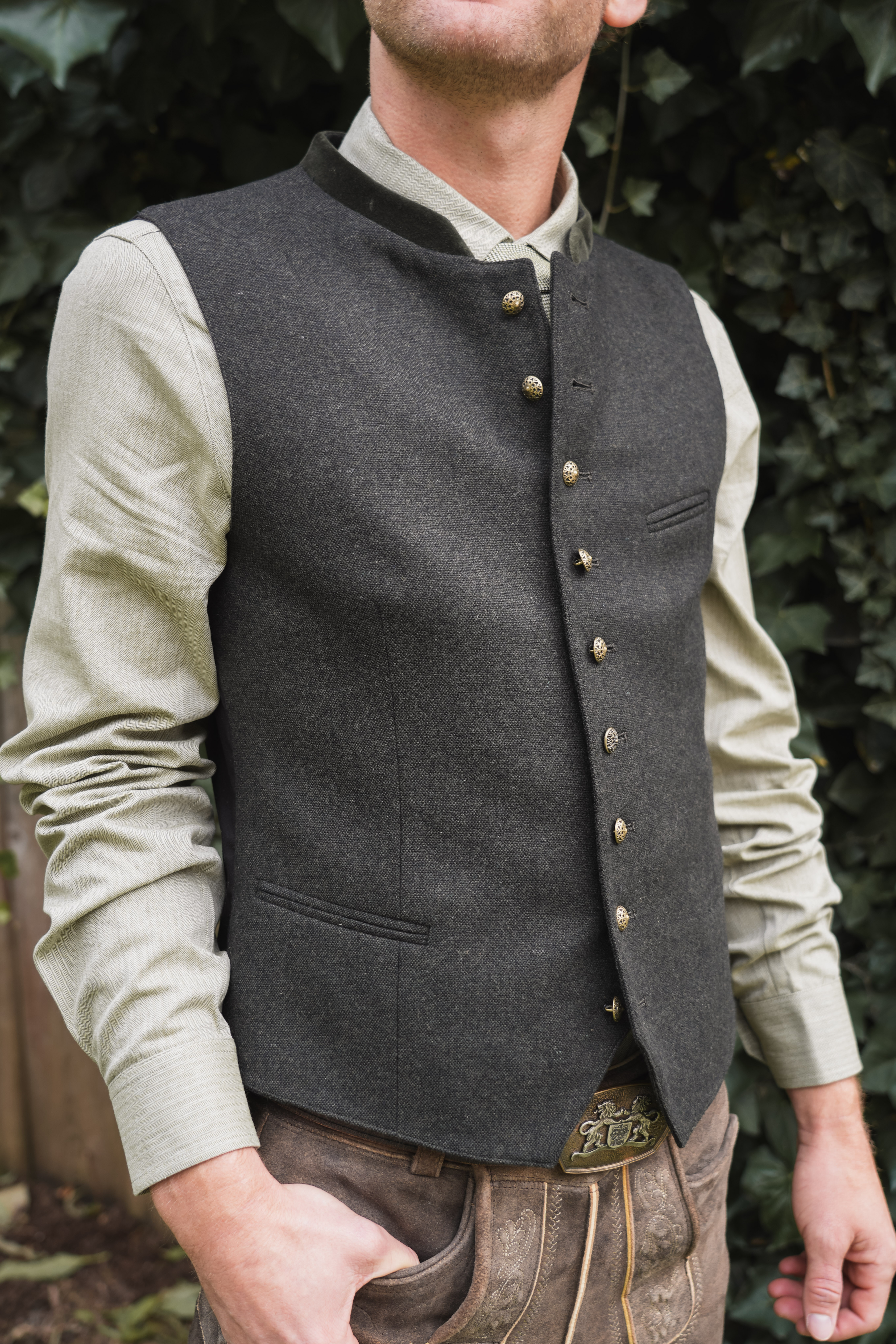 Das Gilet besticht durch seine schlichte, edle Ausstrahlung und seinen klassischen Charakter. Es ist aus einem dunkelgrünen, fein strukturierten Stoff gefertigt, der sowohl robust als auch hochwertig wirkt. Der gerade, leicht taillierte Schnitt sorgt für eine schöne, klare Silhouette und lässt das Gilet sehr harmonisch mit einem traditionellen Outfit verschmelzen.