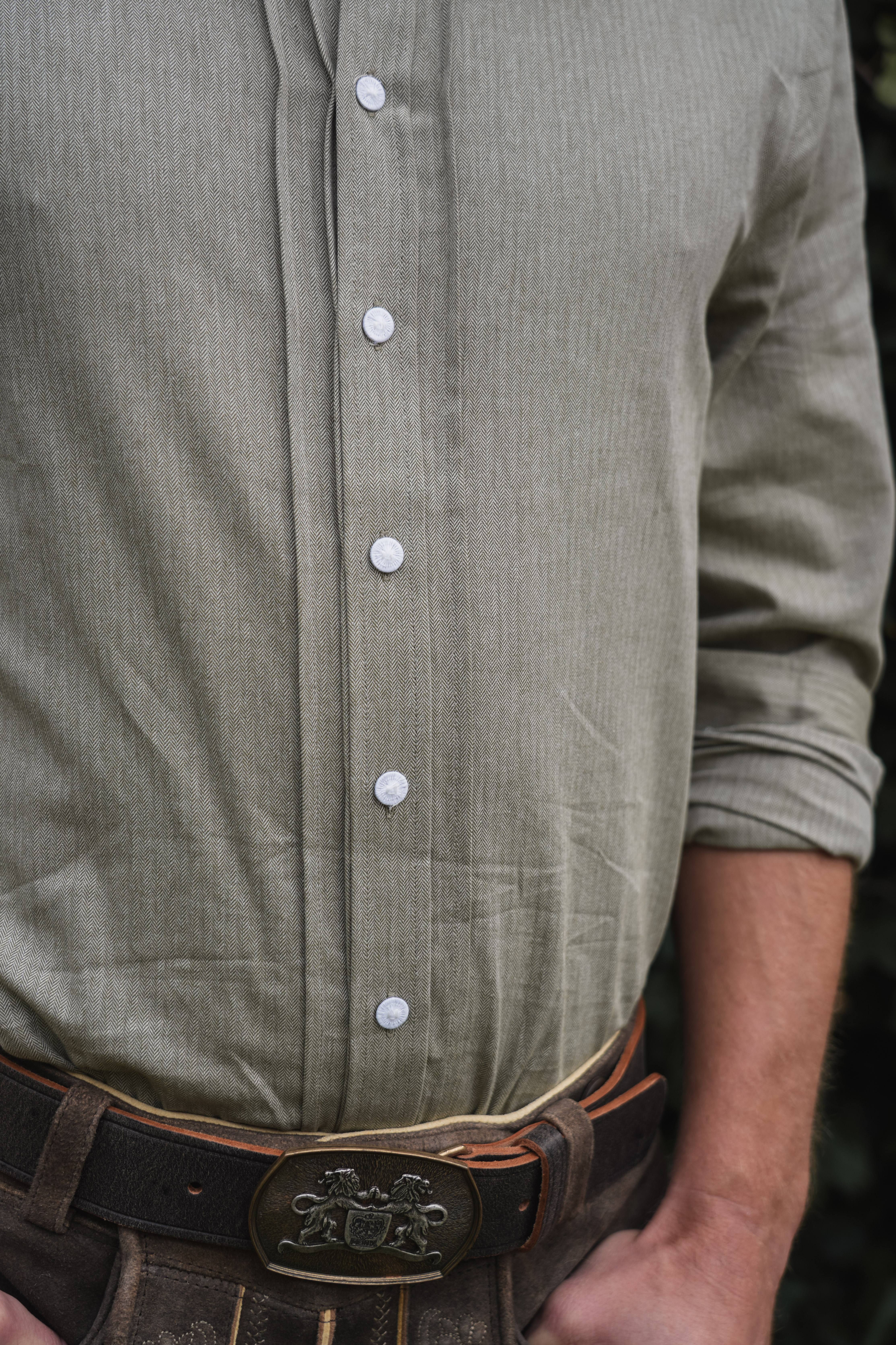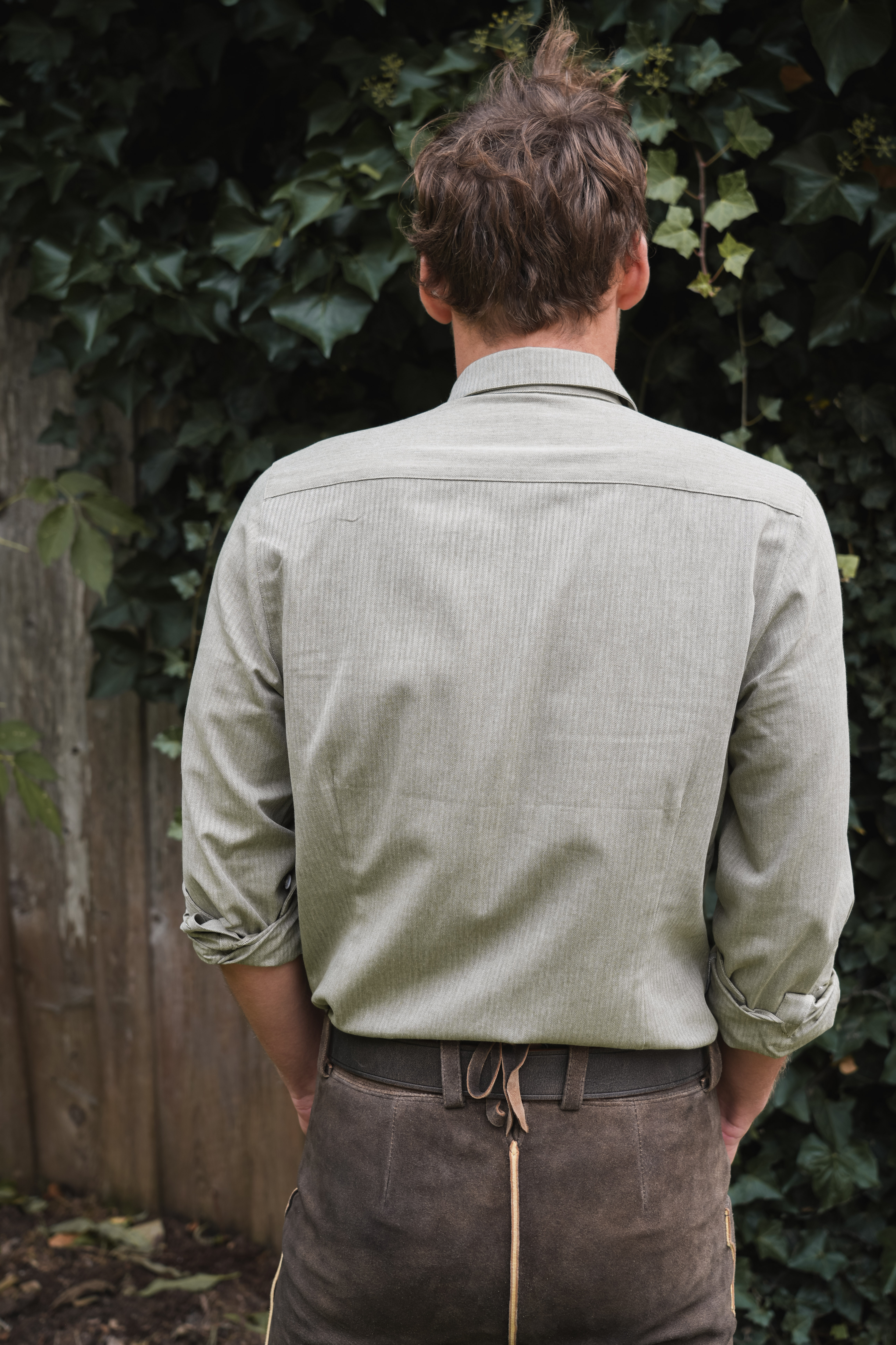 Das Hemd von Grasegger ist klassisch, schlicht und hochwertig verarbeitet. Es besteht aus einem feinen, glatten Stoff in einem dezenten, hellolivgrünen Farbton, der einen natürlichen und traditionellen Charakter ausstrahlt. Die Oberfläche hat eine leichte Struktur, wodurch das Material elegant und gleichzeitig robust erscheint.